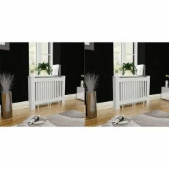 This radiator cover cabinet will make a stylish and practical addition to your living room. It is designed to give your radiator a decorative function and some additional shelf space for photo frames, books, ornaments, etc. Made of high-quality MDF, the radiator cover cabinet is sturdy and durable. The heating cover cabinet has a modern, slatted design that suits any decor and is very easy to assemble. Delivery includes 2 radiator covers.